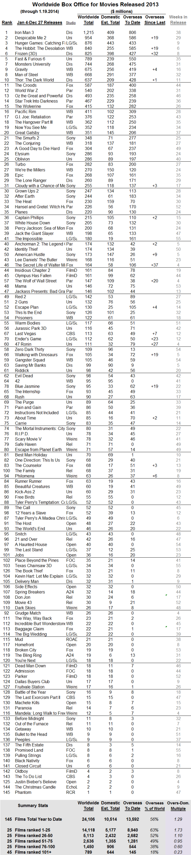 International box office for 2013 releases through January 19, 2014.