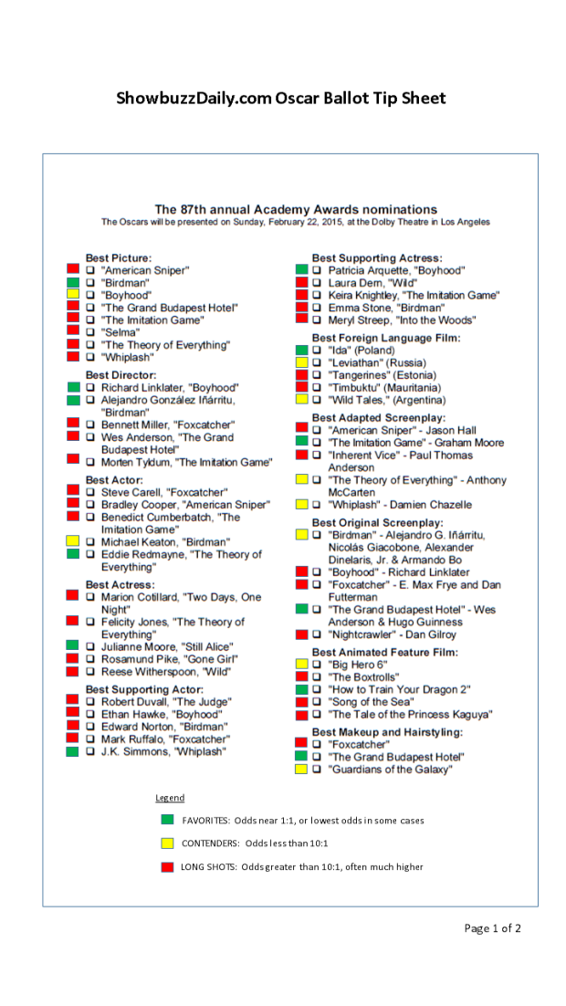 The nominees with a green box to the left are Favorites: with odds near even money. The yellow nominees are real Contenders, with odds under 10:1, usually around 3:1 or 5:1. And the red nominees are the true Long Shots: odds over 10:1, usually well over, in the 50:1 range or more.