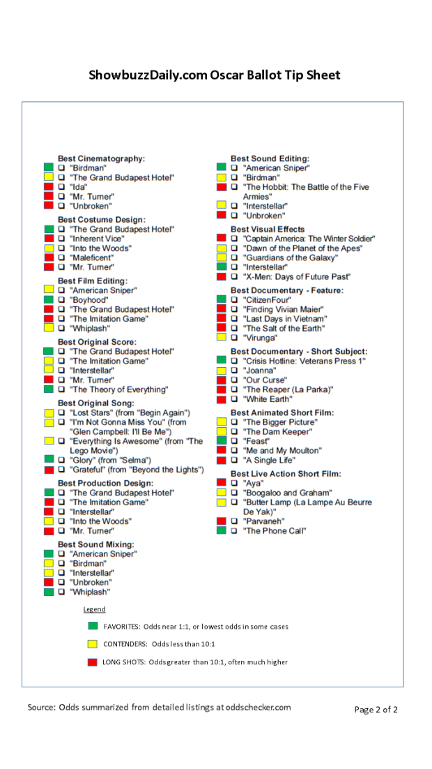 In case you are staring at an Oscar ballot this afternoon or this evening and have no idea what to select, especially in the “down ballot” categories such as documentaries, foreign language film, or the technical awards, never fear. Lean on the professional oddsmakers to help to separate the wheat from the chaff. Instead of simply guessing on a category that is a total mystery to you, the chart below will help you narrow down your selection to the nominees that have a reasonable shot of winning.
