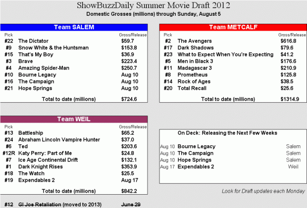 Memorial Day weekend pushed Team Metcalf’s front-loaded slate to $682 million through Monday in the second annual ShowbuzzDaily Summer Movie Fantasy Draft, with only two significant films left to open on his slate: Prometheus (#8 pick overall) and Madagascar 3 (#11), both opening June 8. Team Weil totals $47 million so far (with Battleship his lone…