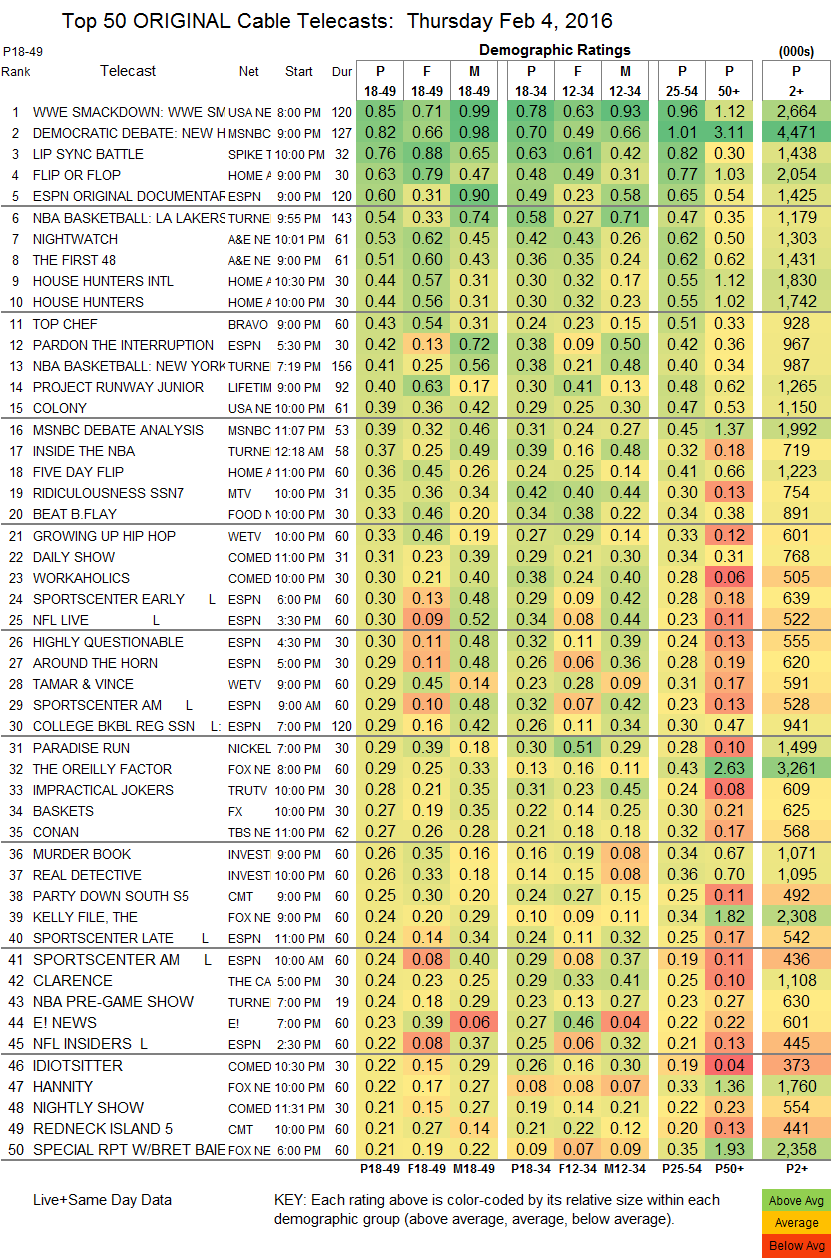 | Top 150 Original Cable Telecasts: Thursday February 4, 2016 | P18-49 | P2+ | ||||