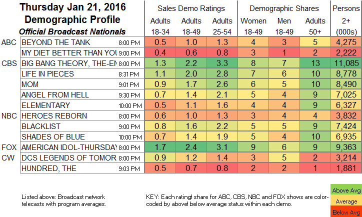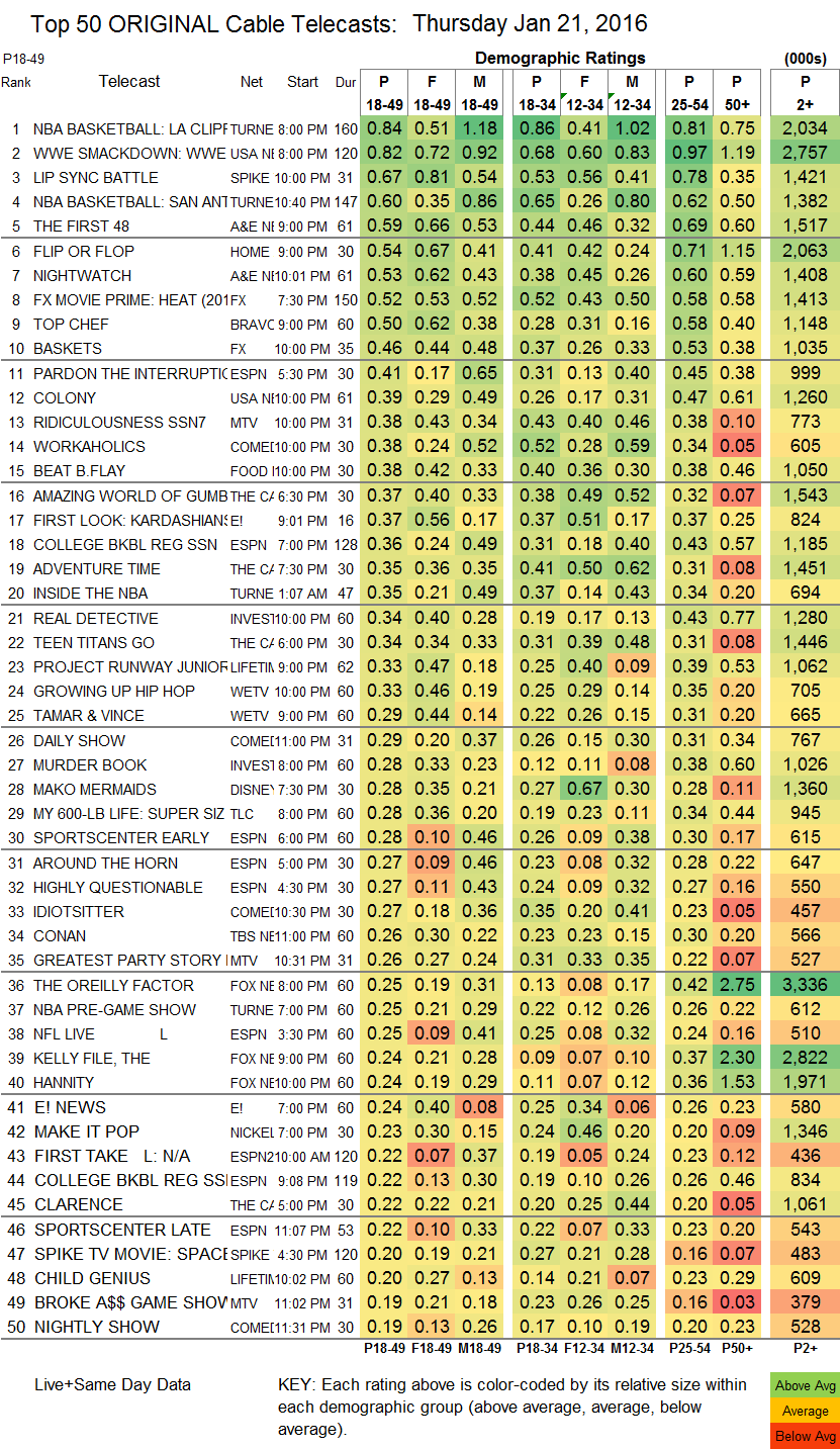 | Top 150 Original Cable Telecasts: Thursday January 21, 2016 | P18-49 | P2+ | ||||
