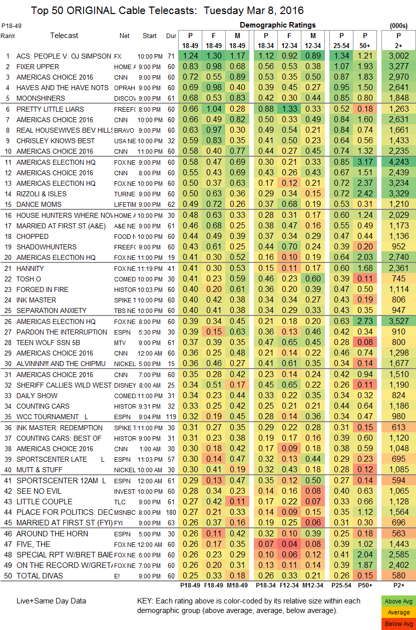 CABLE HIGHLIGHTS: FX’s THE PEOPLE V. OJ SIMPSON continued its high-velocity run, up 0.09 to 1.24. HGTV’s FIXER UPPER added 0.02 to 0.83, with HOUSE HUNTERS WHERE ARE THEY NOW at 0.48. Three installments of CNN’s PRIMARY COVERAGE hit the Top 10, led by the 9PM hour at 0.72. (As usual, Fox News’s coverage ranked a bit lower in 18-49s, with 0.58 as its highest number, but dominated in the older demo and thus total viewers.) OWN’s THE HAVES AND HAVE NOTS dropped 0.06 to 0.69. On Discovery, MOONSHINERS climbed 0.09 to 0.68. On Freeform, PRETTY LITTLE LIARS had a good night, up 0.11 to 0.66, and SHADOWHUNTERS gained 0.06 to 0.43. On Bravo, REAL HOUSEWIVES OF BEVERLY IHLLS rose 0.03 to 0.63, and TOUR GROUP sank by a hundredth to 0.10. USA’s CHRISLEY KNOWS BEST returned at 0.59. TNT’s RIZZOLI & ISLES rebounded from last week by 0.14 to 0.50. On Lifetime, DANCE MOMS was steady at 0.49, and MOTHER/DAUGHTER EXPERIMENT climbed 0.04 to 0.23. A&E’s MARRIED AT FIRST SIGHT lost 0.03 to 0.46, and FIT TO FAT TO FIT was down 0.02 to 0.24. Food Network’s CHOPPED rose a tenth to 0.44. On Comedy Central, TOSH.0 fell 0.07 to 0.41, and NOT SAFE WITH NIKKI GLASER was down 0.02 to 0.25. History’s FORGED IN FIRE was up 0.03 to 0.40, but COUNTING CARS (airing after a 0.31 clip show) dropped 0.11 to 0.33. Spike’s INK MASTER was at 0.40 after 2 episodes last week at 0.32/0.43, and INK MASTER REDEMPTION held at 0.31. MTV’s TEEN WOLF dropped 0.05 to 0.37, and an episode of TRUE LIFE in the 10PM slot was at 0.14. On TLC, THE LITTLE COUPLE lost 0.06 to 0.27, and RATTLED fell 0.03 to 0.20. E!’s TOTAL DIVAS was off by 0.08 to 0.25, and JUST JILLIAN remained at 0.16. WGNAmerica’s OUTSIDERS dropped 0.05 to 0.24. BET’s IT’S A MANN’S WORLD was at 0.22/0.21 after last week’s 0.33/0.31. Pop’s IMPACT WRESTLING fell 0.02 to 0.06/222K, with the re-airing down 0.01 to 0.01/58K.