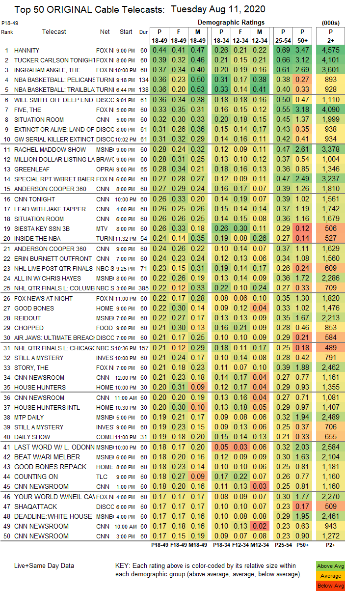 | Top 150 Original Cable Telecasts: Tuesday August 11, 2020 | P18-49 | P2+ | ||||