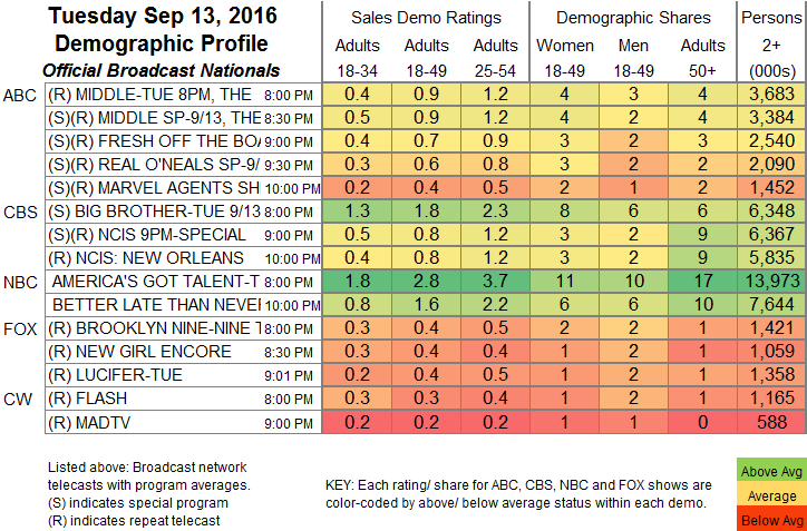 NETWORK FINALS: As has been common on the last few Tuesdays, NBC’s AMERICA’S GOT TALENT and BETTER LATE THAN NEVER swapped 0.1s in final numbers, respectively up and down. Elsewhere, the BROOKLYN NINE-NINE, NCIS, FRESH OFF THE BOAT, REAL O’NEALS and AGENTS OF SHIELD reruns all dropped 0.1.
