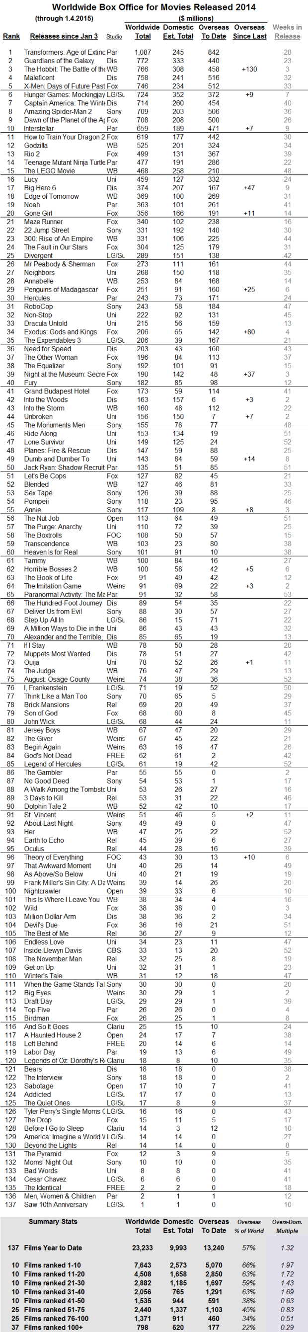 Scroll down for domestic and overseas grosses for each film individually so far in 2014.