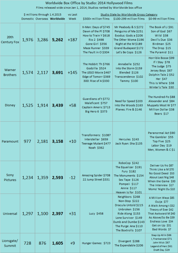 WORLDWIDE STUDIO SCORECARD. Scroll down for domestic and overseas grosses for each film individually so far in 2014. YEAR TO DATE BOX OFFICE. Looking at North American box office, 2014 is still running -8% behind last year and now -6% below the average for this point the past four years…