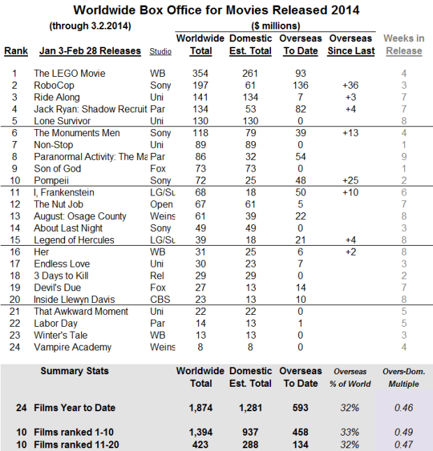WORLDWIDE STUDIO SCORECARD. Year to date, Warner Brothers has pulled ahead thanks to the opening of 300: Rise of an Empire and recent overseas grosses from The LEGO Movie, as it really kicks into gear outside North America. Scroll down for domestic and overseas grosses for each film individually so far in…