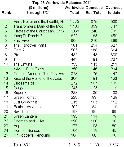 The Smurfs has risen to #10 on the 2011 worldwide chart, with some more potential to go in overseas dollars. However, it will be a tall order to rise to #9 and catch Thor.