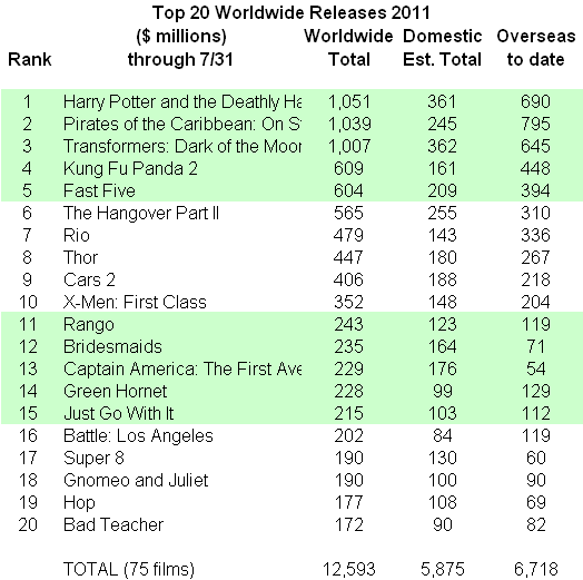 The three films opening in North America this weekend are debuting on the worldwide gross list outside the Top 20: The Smurfs at #27 ($122 million projected total domestic and $4 million overseas to date), Cowboys & Aliens at #34 ($98 million projected domestic total and no overseas gross to date) and Crazy, Stupid, Love at #48 ($72 million projected domestic and no overseas to date).