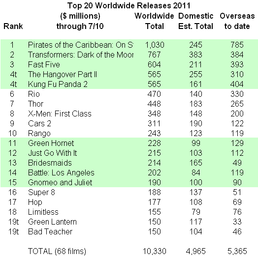 The two new movies this weekend debuted outside the top 20: Horrible Bosses at #28 ($97 million worldwide, $97 million estimated domestic total, no overseas gross to date) and Zookeeper at #43 ($73 million worldwide, $66 million estimated domestic gross, $8 million overseas gross to date).