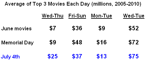 The table below summarizes box office activity for a Wednesday-Tuesday week for our June baseline, Memorial Day and July Fourth. Interestingly, the same number of dollars are available July Fourth as Memorial Day (around $75 million for a top performing film) — but the dollars are spread more evenly across the week of Independence Day. The Friday-Sunday portion of July Fourth week is actually identical to a normal weekend in June, while there is a huge pop in the Wednesday-Thursday opening period and a moderately strong Monday-Tuesday follow-up (somewhere between Memorial Day and June levels).