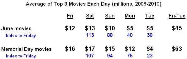 As a baseline, we looked at the four or five weeks of June (between the atypical Memorial Day and July Fourth weeks). We focused on the top three movies each weekend, usually one or two opening films and one or two strong returning films. In June, the average top three film generates $12 million on Friday, bumps up 13% to $13 million on Saturday, and then declines gently to $10 million on Sunday. (The index values in blue in the table below simply refer to the percentage of Friday business each day represents — for example, in June, Sunday is 88% of the Friday level.)