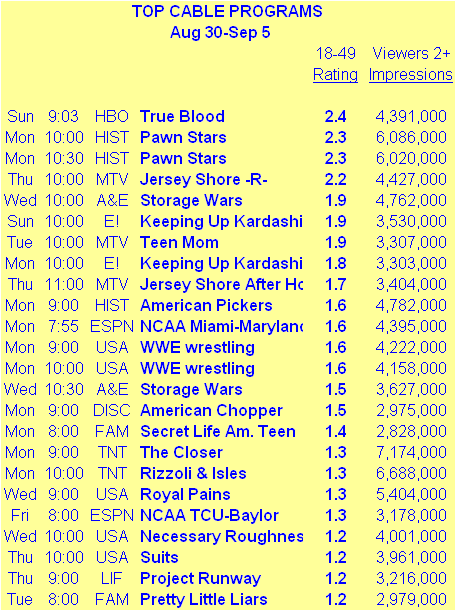 THE SKED: Cable Ratings Aug 29-Sep 5