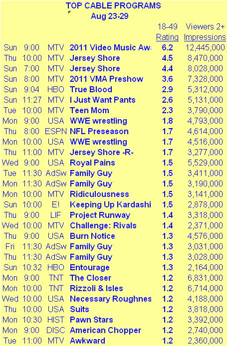 >The cable landscape this week was dominated by MTV, a network that has gone through many incarnations and ups and downs over the past few decades.  Now it is going through a red-hot period.  The top four cable programs this week could be found on MTV, led by the simply terrific performance of the Video Music Awards.  Over a 6 rating with young adults and almost 12.5 million viewers of any age during an average minute.  These are ratings that a broadcast network would be ecstatic about not only in the summer but also in the traditional television season.