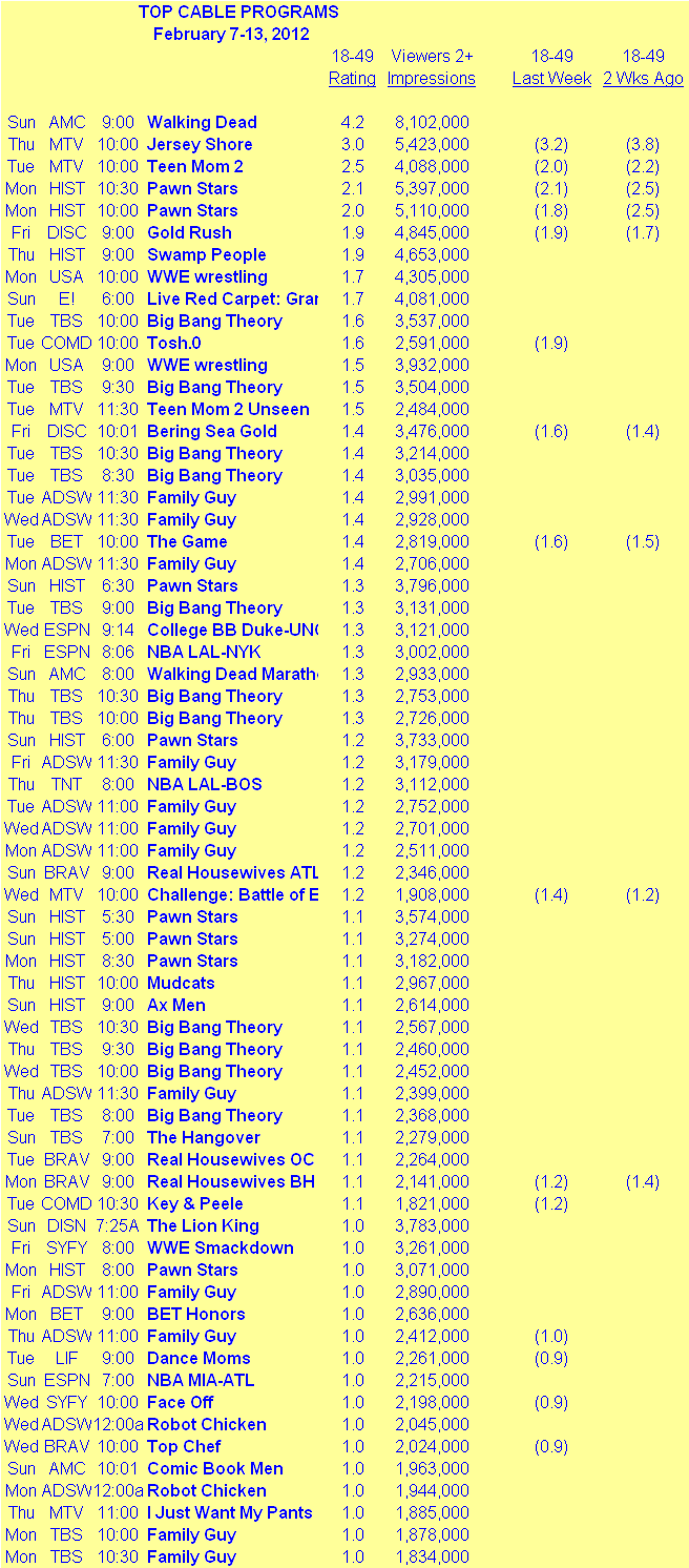 >AMC’s Walking Dead is the new king of the weekly cable ratings chart, with a terrific 4.2 Adult 18-49 rating for Sunday’s season premiere. Read more on the Walking Dead premiere here. The rest of the top-rated cable programs are pretty much unchanged. While Jersey Shore continues its downward trend, the other MTV hit, Teen Mom 2, ticked up nicely. Pawn Stars (History) and Gold Rush (Discovery) continue to deliver their reliably solid audience levels.