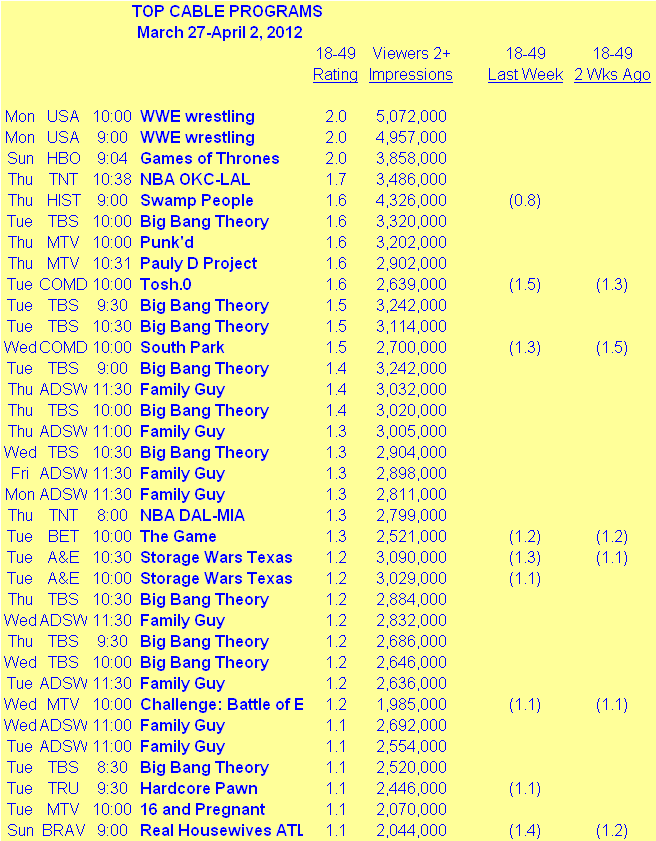 >Two polar opposites in terms of programming quality occupy the top of the weekly cable ratings chart.  Two hours of USA’s WWE wrestling extravaganza and HBO’s Game of Thrones each rated a very solid 2.0 rating with Adults 18-49.  The HBO rating is a far greater accomplishment because the pay cable network is available in a small minority of US television homes (a little more than a quarter), while USA is available in nearly every cable or satellite home (almost nine in ten US households).  Click “read more” to see the updated weekly chart.