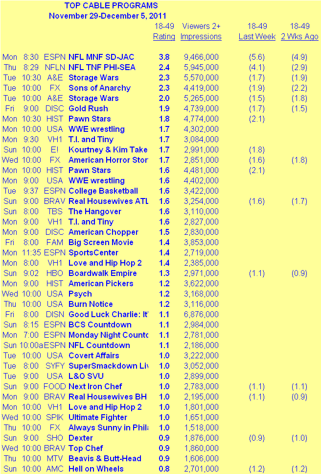 >Really weak ratings for both ESPN’s Monday Night Football and NFL Network’s Thursday Night Football this week, but both still landed at the top of the cable ratings chart with Adults 18-49. Following close behind the Thursday night NFL game were unscripted king Storage Wars and top scripted show Sons of Anarchy, both of which were up substantially from last week.