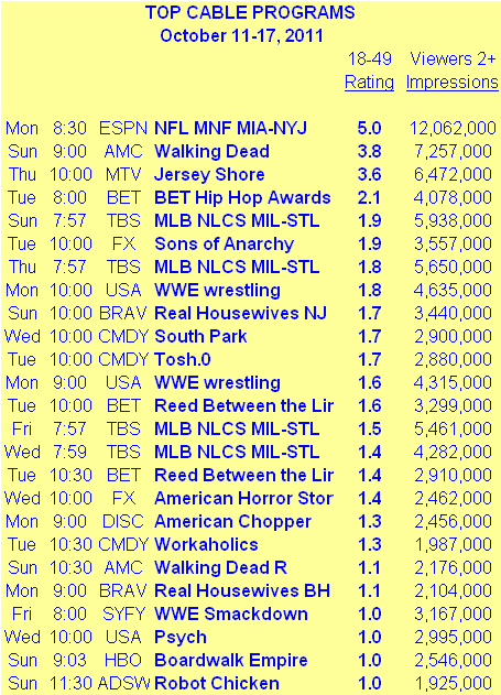 >ESPN’s Monday Night Football this week was down from a 6.9 to a 5.0 rating this week. Blame AFC teams and a lopsided score. Jersey Shore was down a tenth of a rating point and pushed into third place by a very good season premiere of Walking Dead on AMC. BET’s Hip Hop Awards scored a 2.1 and edged the best baseball could do on cable this week, a 1.9 for Sunday’s concluding Game 6 of the National League Championship Series. It’s going to be a tough World Series for FOX.