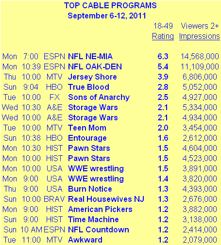 Jersey Shore’s reign at the top of the weekly cable chart is over. The NFL double-header on ESPN’s Monday Night Football saw to that. The early game started at 7:00 ET and scored a 6.3 demo rating, down from last year’s ESPN opener but still potent. The later game, featuring a late start time for the vast majority of the country (remember about 78% of the US population lives in the Eastern or Central time zone), included teams with less national appeal. Honorable mention goes to HBO’s Curb Your Enthusiasm’s season finale, which hit a 1.0 rating. It’s not quite enough to make our chart and not in the same league as its lead-in Entourage or True Blood, but it is a good number for a very funny — if sometimes erratic — series. Also, AMC’s Breaking Bad hit a 0.9 demo rating as it builds toward its season finale. I’m sure it’s not everyone’s cup of tea, but Breaking Bad features great storytelling and exceptional acting. Perhaps it will fight its way onto the chart as the DEA, the Mexican Cartel, and his own conscience close in on Walter White.