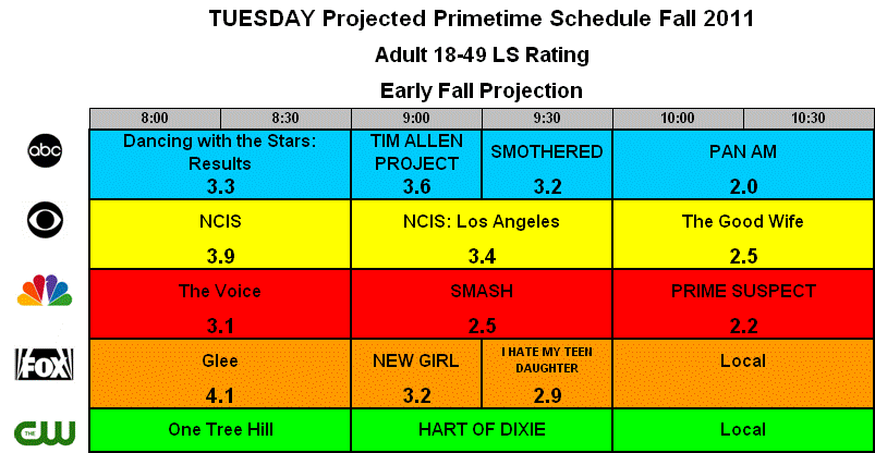 Welcome to ShowbuzzDaily’s coverage of the upcoming TV schedules for the 2011/12 TV season! Above you see our guide to what to expect on Tuesday nights this Fall: the numbers are our projected Adults 18-49 ratings for each show; the capitalized titles are the new shows; and italics are for shows changing their time slots. Here’s our analysis of what will really be going on behind the numbers: