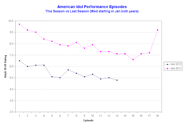 The chart below displays the Adult 18-49 rating for each American Idol performance episode this year and last year. The drop from 2012 is truly stunning when laid out visually — about 3 rating points each week (35-40%) have simply disappeared, but the interesting thing to note in the chart is that the 2012 track has simply shifted down from 2011: the underlying pattern of the program has remained relatively intact. Just like 2011 (and the years before it), 2011 started at a peak and then steadily declined until episode 11 (two weeks ago) and then started to stabilize. If the rest of this year continues to act like previous seasons, Idol will hold right around a 5.0 rating until the third week of the May sweep and the finale the last week of May should kick up to around a 6.0 rating, maybe a 6.4 rating.