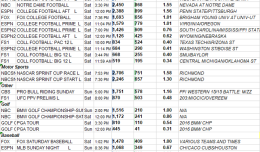 Here are the weekend sports ratings for Saturday and Sunday September 9-10, 2017.  Eligible programs include sporting events on broadcast and cable networks (minimum audience size 300K P2+).  Programs are grouped by sport a...