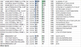 Here are the weekend sports ratings for Saturday and Sunday November 4-5, 2017.  Eligible programs include sporting events on broadcast and cable networks (minimum audience size 300K P2+).  Programs are grouped by sport and...